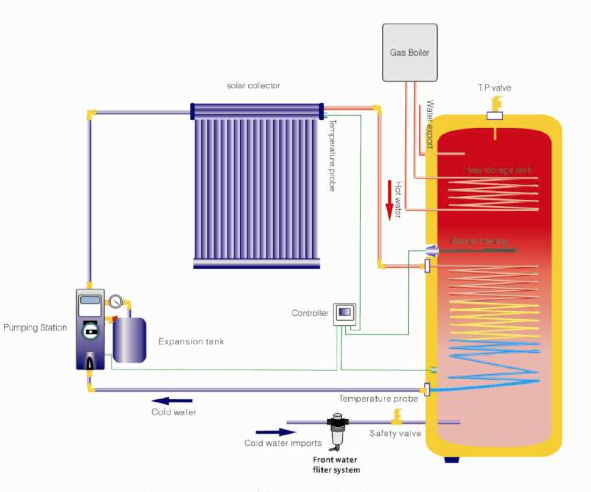 4. The heat-conducting liquid transfers heat to water by lower heat exchanger in the water tank.